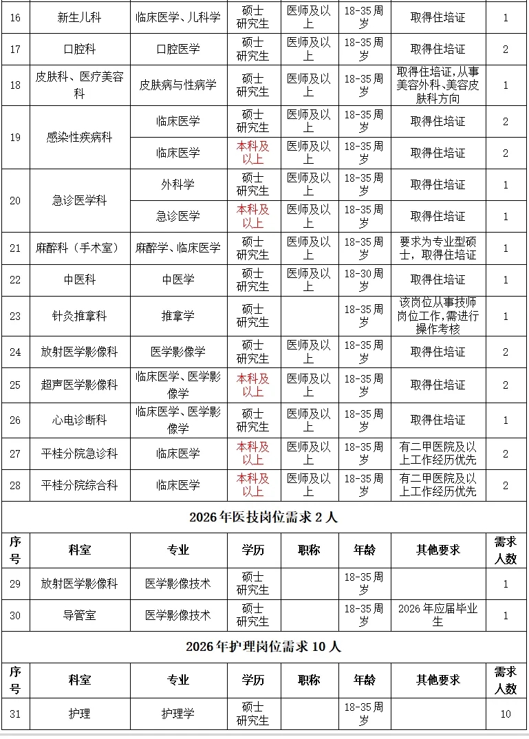 根據(jù)醫(yī)院發(fā)展規(guī)劃,招聘工作堅(jiān)持公平公正公開,堅(jiān)持德才兼?zhèn)洹⑷藣徬噙m、擇優(yōu)錄取、雙向選擇的原則,2026年計劃引進(jìn)博士、碩士高層次人才及招聘工作人員共計50名(詳見附件:賀州市人民醫(yī)院2026年招聘需求信息)。
