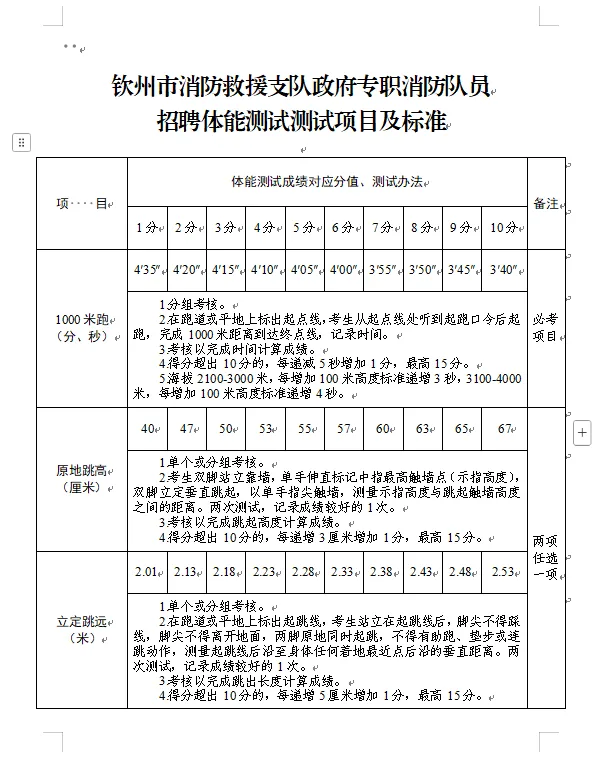 2.體能測試:(1)必考項(xiàng)目:1000米跑;(2)選考項(xiàng)目:①立定跳遠(yuǎn)、原地跳高二選一;②單杠引體向上、俯臥撐二選一;③10米×4往返跑、100米跑二選一;(3)注意事項(xiàng):應(yīng)聘人員須參加體能測試,并當(dāng)場簽訂《體能測試健康安全風(fēng)險(xiǎn)承諾書》,體能測試有兩項(xiàng)及兩項(xiàng)以上不得分的視為不合格(標(biāo)準(zhǔn)參照附件)。未按時(shí)參加或因身體原因無法測試者,視為自動放棄。(體能測試測試項(xiàng)目及標(biāo)準(zhǔn)附后)