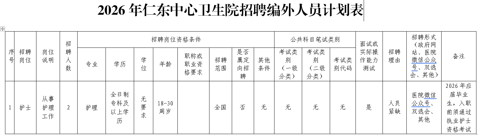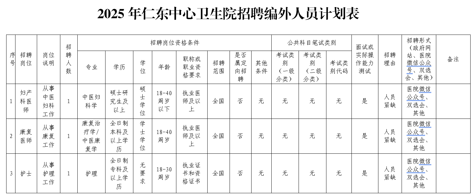7.學(xué)歷、專業(yè)及其他任職要求詳見仁東中心衛(wèi)生院招聘編外人員計劃表。